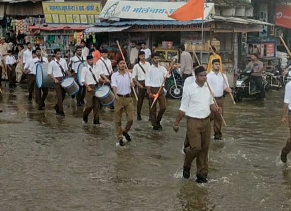 रिमझिम बरसात में बहते हुए पानी में ठाकुर बाबा बस्ती का पथ संचलन कदम से कदम मिलते हुए निकला