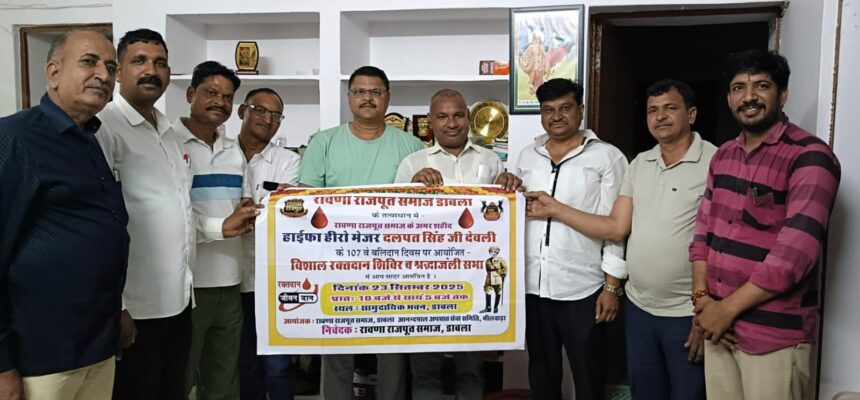 रावणा राजपूत समाज के अन्तराष्ट्रीय आइकॉन हाइफ़ा हीरो मेजर दलपत सिंह शेखावत के 107 वें बलिदान दिवस पर रावणा राजपूत समाज डाबला भीलवाड़ा के तत्वावधान में आयोजित होने वाले विशाल रक्तदान शिविर एवं श्रद्धांजलि सभा के पोस्टर का विमोचन गुलाबपुरा में पुलिस उपाधीक्षक जितेंद्र सिंह मेड़तिया एवं अंटाली तहसीलदार गणेशसिंह कच्छावा ने किया। इस दौरान शाहपुरा जिले के पूर्व जिलाध्यक्ष ललितसिंह भाटी डाबला,पूर्व पार्षद मुकेशसिंह खींची,भाजपा ओबीसी जिला मंत्री एवम पार्षद प्रतिनिधि महेंद्रसिंह चुंडावत,राजवीरसिंह भोजरास,विजयसिंह पंवार,जगदीश सिंह शेखावत, राजेशसिंह चौहान, पुष्पेन्द्र सिंह पुरावत सहित मौजूद थे