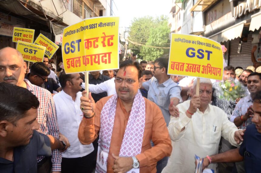 जीएसटी कटौती को लेकर मुख्यमंत्री भजनलाल शर्मा व भीलवाड़ा साँसद दामोदर अग्रवाल आज अचानक भीलवाड़ा शहर के सरकारी दरवाजा मार्केट पहुचे मुख्यमंत्री जीएसटी कटौती की तख्तियां हाथ में लेकर व्यापारियों के पास पहुंचे वह कहा कि प्रधानमंत्री नरेंद्र मोदी ने देश की व्यापार समृद्धि के लिए जीएसटी में कटौती की है जिससे आने वाले त्योहारों में आपके व्यापार में दिन दुगनी रात चौगुनी तररकी हो।