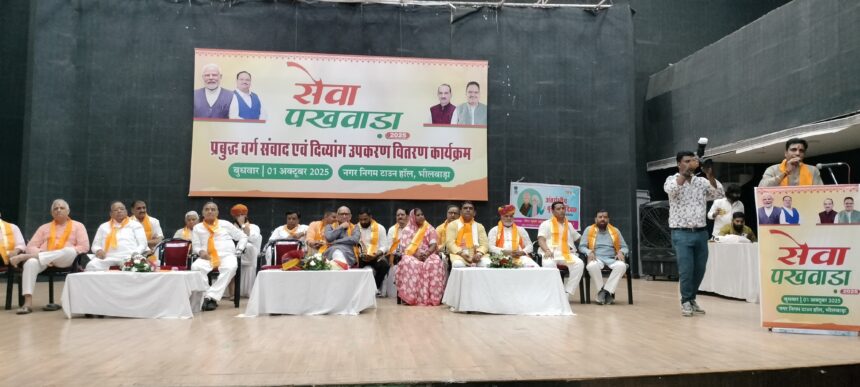 भीलवाड़ा 1 अक्टूबर। भारतीय जनता पार्टी द्वारा मनाए जा रहे सेवा पखवाड़े के अंतर्गत स्थानीय टाउनहॉल में आयोजित प्रबुद्ध जन संवाद एवं दिव्यांगजन उपकरण वितरण समारोह भाजपा के पूर्व प्रदेश अध्यक्ष अशोक परनामी के मुख्य आतिथ्य में आयोजित हुआ। अध्यक्षता भाजपा जिलाध्यक्ष प्रशांत मेवाड़ा ने की। जिला प्रमुख बरजी देवी भील, विधायक जब्बरसिंह सांखला, लालाराम बैरवा, लादूलाल पीतलिया, पूर्व मंत्री कालूलाल गुर्जर, पूर्व सांसद सुभाष बहेडिया, पूर्व विधायक विट्ठल शंकर अवस्थी, बालूराम चौधरी, महापौर राकेश पाठक, उपजिला प्रमुख शंकरलाल गुर्जर, पूर्व जिला प्रमुख शक्तिसिंह हाड़ा, रामचंद्र सेन, जयपुर शहर के पूर्व जिलाध्यक्ष संजय जैन, सेवा पखवाड़ा संयोजक एवं जिला महामंत्री अविनाश जीनगर, कन्हैयालाल जाट ,प्रबुद्धजन संवाद संयोजक छैलबिहारी जोशी, दिव्यांगजन उपकरण वितरण संयोजक रामपाल चौधरी भी मंचासीन रहे।