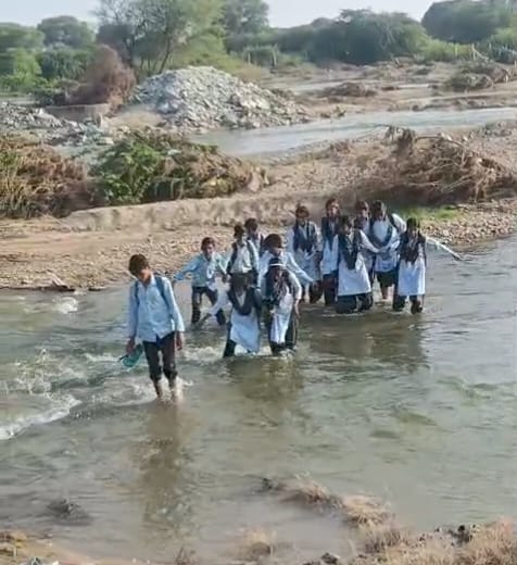 खेजड़ी से नाहरगढ मार्ग खारी नदी मे पुलिया बह जाने से स्कूली बच्चे जान जोखिम मे डाल कर नदी पार कर रहे है।