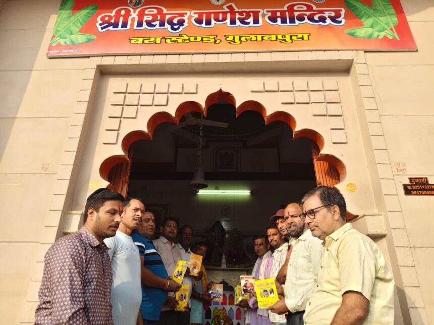 राष्ट्रीय स्वयंसेवक संघ के गुलाबपुरा नगर के स्वयंसेवकों ने बस स्टैंड स्थित सिद्ध श्री गणेश मंदिर पर भगवान श्री गणेश को शताब्दी वर्ष के गृह संपर्क अभियान का निमंत्रण दे कर अभियान का शुभारंभ किया। संघ के स्वयंसेवक नगर की पांचो बस्तियों सहित खण्ड के सभी 93 गांवों के प्रत्येक घर में संपर्क कर बाबा साहब भीमराव अंबेडकर,महाराणा प्रताप, गोविंद गुरु एवं संघ यात्रा की चार पुस्तक एवं भारत माता के चित्र का स्टीकर व पंच परिवर्तन का पत्रक घर घर देकर सामाजिक समरसता कुटुंब प्रबोधन नागरिक शिष्टाचार पर्यावरण एवं स्वयं का बोध के माध्यम से समाज में परिवर्तन लाने का आग्रह करेंगे । निमंत्रण के इस कार्यक्रम में गुलाबपुरा नगर के स्वयंसेवक उपस्थित रहे ।