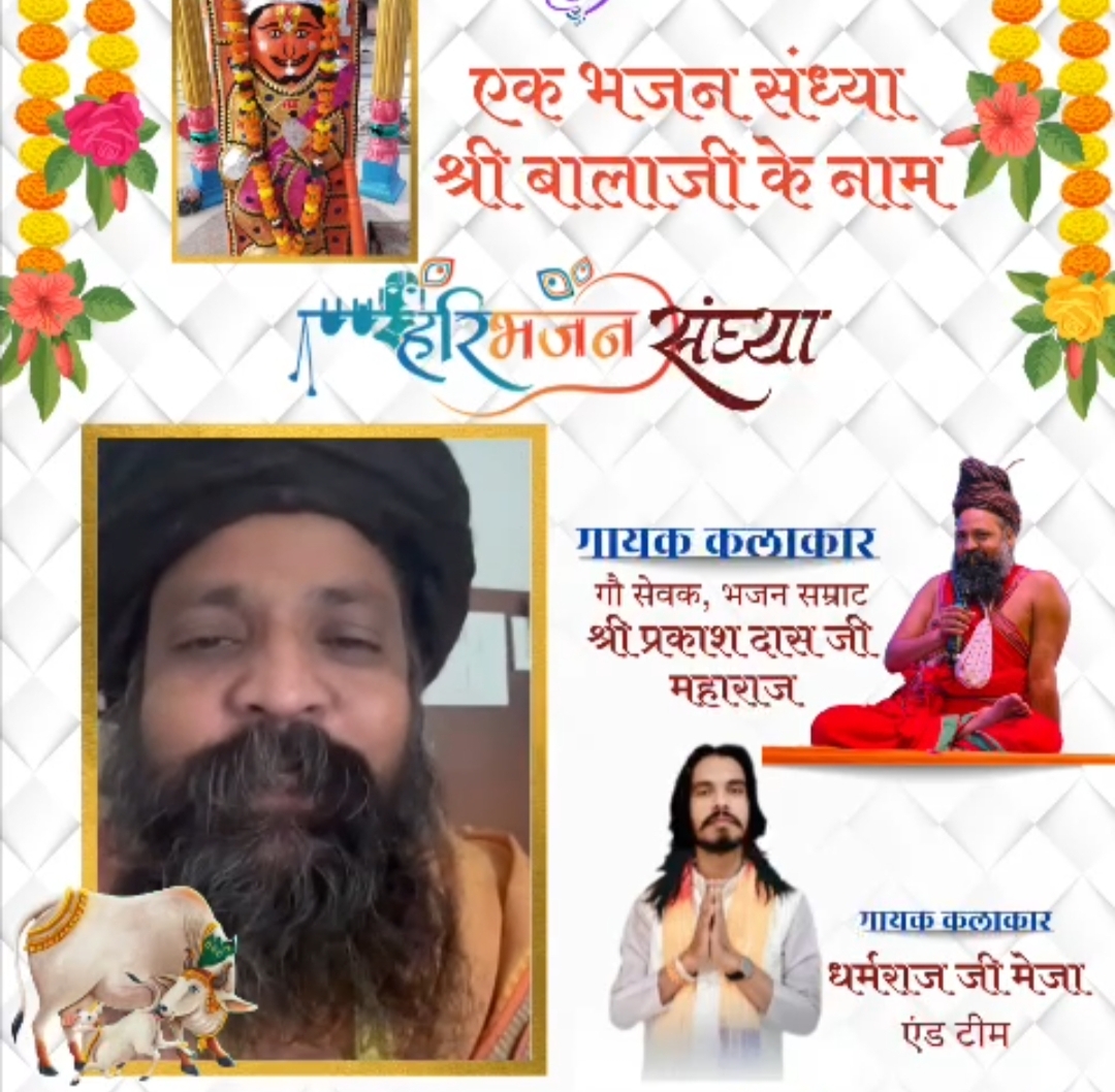 भजन संध्या में देशभर में प्रसिद्ध भजन सम्राट गौसेवक श्री प्रकाश दास जी महाराज तथा लोकप्रिय भजन गायक धर्मराज जी मेजा एवं टीम अपने मधुर भजनों के माध्यम से श्रद्धालुओं को भक्ति रस में सराबोर करेंगे।