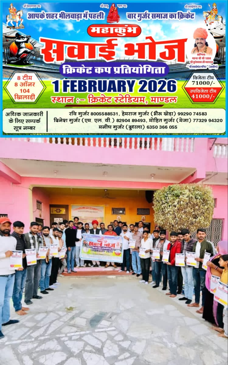 आसींद (भीलवाड़ा) | मोनू सुरेश छीपा आसींद के सुप्रसिद्ध सवाई भोज मंदिर प्रांगण में रविवार को ‘सवाई भोज क्रिकेट प्रतियोगिता’ के पोस्टर का विमोचन समारोह अत्यंत भव्यता और श्रद्धा के साथ संपन्न हुआ। इस आयोजन ने न केवल खेल प्रेमियों बल्कि पूरे गुर्जर समाज और क्षेत्र के युवाओं में एक नई ऊर्जा भर दी है।