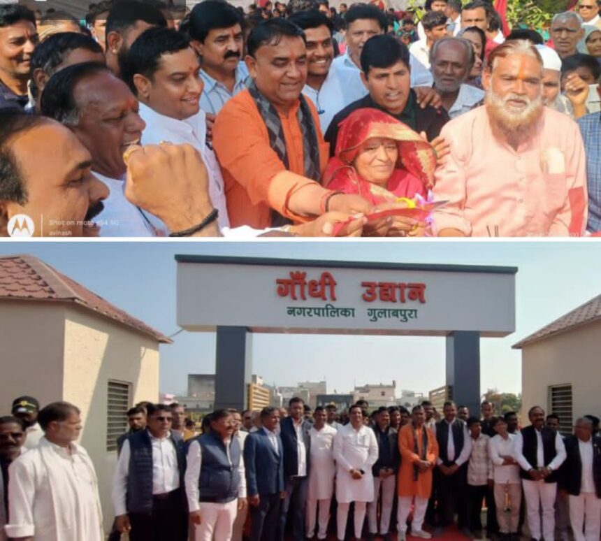 गुलाबपुरा (रामकिशन वैष्णव) क्षेत्रीय विधायक जब्बर सिंह सांखला ने नगर पालिका द्वारा नवनिर्मित दो करोड़ की लागत के गांधी उद्यान (पार्क) का लोकार्पण किया। लोकार्पण कार्यक्रम मुख्य अतिथि विधायक जब्बरसिंह सांखला व नगरपालिका अध्यक्ष सुमित काल्या, भाजपा नगर अध्यक्ष इन्द्रजीत सिंह राठौड़, पार्षद मीरा गोपाल प्रजापत, नगर कांग्रेस अध्यक्ष मधुसूदन पारीक के आतिथ्य में हुआ। श्री गांधी विधालय के सामने नवनिर्मित उद्यान के मुख्य द्वार पर महात्मा गांधी की दांडी यात्रा का स्टेचू भी स्थापित किया गया है। नवनिर्मित पार्क में लगभग 2 करोड़ के लागत से कई सुविधाएं स्थापित की गई है जिसमे फाउंटेन, बच्चों के लिए जिम, पाथवे, मिनी स्टेडियम, ग्रीनरी, झूले आकर्षक लाइटिंग सहित आमजन के लिए सुविधाएं है। लोकार्पण कार्यक्रम मे नगर पालिका के पार्षदगण, भाजपा व कांग्रेस के पदाधिकारी व कार्यकर्त्तागण सहित गणमान्यजन मौजूद थे। पार्षद रामदेव खारोल ने कार्यक्रम का संचालन किया।