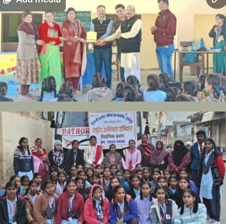 गुलाबपुरा (रामकिशन वैष्णव) पीएम श्री राजकीय बालिका उच्च माध्यमिक विद्यालय गुलाबपुरा में राष्ट्रीय आविष्कार अभियान के अंतर्गत विद्यालय की 50 छात्राओं को अजमेर- पुष्कर शैक्षणिक भ्रमण करवाया गया। साथ ही अंतरराष्ट्रीय वार्ताकार महेश कोली द्वारा विशेषज्ञ वार्ता का आयोजन किया गया ।कार्यक्रम में मुख्य अतिथि रामकिशन कुमावत (आरपी) सीबीइओ हुरड़ा, पुरुषोत्तम शर्मा रहे। संस्था प्रधान श्रीमती मैना कुमारी चारण ने सभी अतिथियों का आभार ज्ञापित किया। प्रभारी श्रीमती प्रतिभा व्यास ने बताया की 326 छात्राएं उक्त वार्ता से लाभान्वित हुई। कार्यक्रम में श्री मति पूर्णा पारिट, श्रीमती निरमा सैनी, श्रीमती चंद्रा जीवनानी, श्री सुरेंद्र कुमार घूसर सहित समस्त स्टाफ मौजूद रहा ।