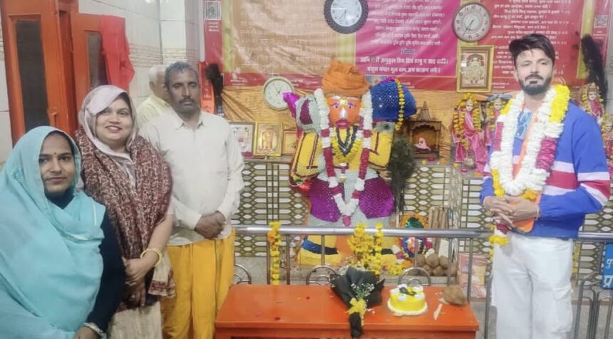 गुलाबपुरा (रामकिशन वैष्णव) स्थानीय श्री संकट मोचन बालाजी मंदिर, बालाजी चौक में बुधवार को गुलाबपुरा बिजनेस इंस्टाग्राम चैनल के माध्यम से स्थानीय व्यापार को बढ़ावा देने वाले एवं वाहेगुरु बेकर्स के संचालक बालाजी भक्त मुकेश तीर्थवानी ने अपना जन्मदिवस श्रद्धा एवं भक्ति भाव के साथ श्री संकट मोचन बालाजी के समक्ष मनाया। भगवान बालाजी के दर्शन कर विशेष पूजा-अर्चना की। मंदिर महंत पवन दास वैष्णव से आशीर्वाद प्राप्त किया एवं क्षेत्र की सुख-समृद्धि की कामना की। श्री संकट मोचन बालाजी मंदिर विकास सेवा समिति की ओर से मुकेश तीर्थवानी का साफा पहनाकर एवं शुभकामनाएं देकर हार्दिक स्वागत अभिनंदन किया गया। समिति के सदस्यों ने उनके सामाजिक सहयोग एवं स्थानीय व्यापार को प्रोत्साहित करने के प्रयासों की सराहना की।इस दौरान मंदिर परिसर में भक्त लोग मौजूद थे।