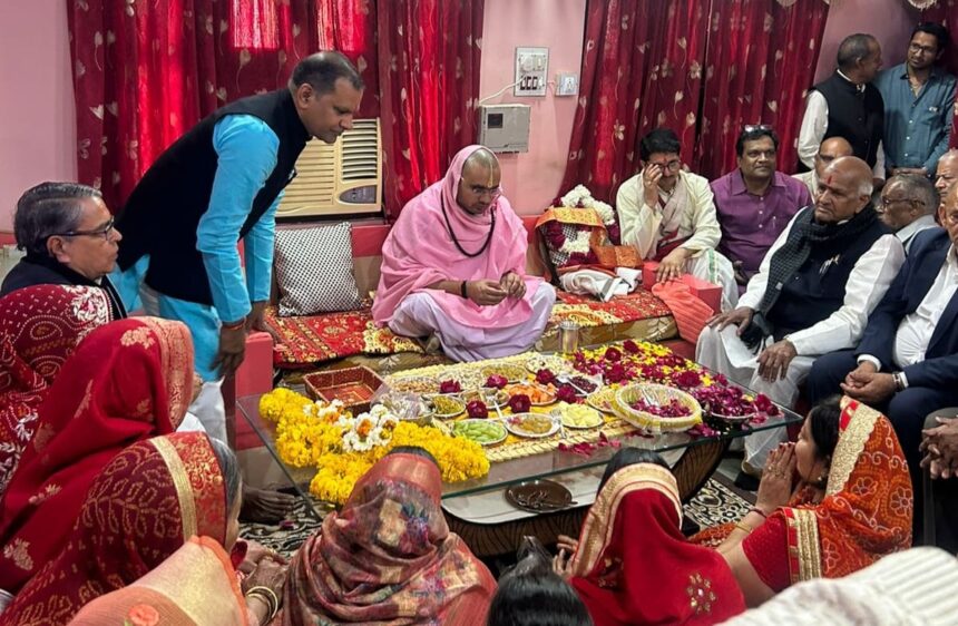 भीलवाड़ा शहर में आयोजित श्रीमद् भागवत कथा के पावन अवसर पर रामस्नेही संप्रदाय के सुप्रसिद्ध संत दिग्विजय राम महाराज इन दिनों भक्तों के बीच पहुंच रहे हैं। शुक्रवार प्रातः शहर के सांगानेरी गेट स्थित भदादा मोहल्ला में उदयलाल समदानी के निवास पर महाराज श्री की ‘पदरावणी’ हुई, जहाँ उन्होंने सत्संग और प्रवचनों के माध्यम से श्रद्धालुओं को जीवन का सार समझाया।