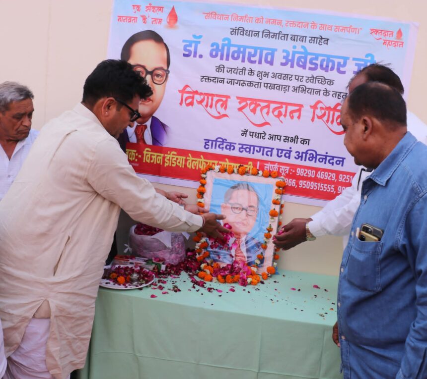 गुलाबपुरा (रामकिशन वैष्णव ) स्थानीय कांग्रेस कार्यकर्त्ताओ ने अंटाली मे आयोजित बाबा साहेब अंबेडकर जयंती पर विजन इंडिया वेलफेयर सोसायटी का विशाल रक्तदान शिविर मे पहुंच कर किया रक्तदान। अंटाली सामुदायिक स्वास्थ्य केंद्र में आयोजित स्वैच्छिक रक्तदान शिविर 712 यूनिट रक्त संग्रहित हुआ । शिविर मे मुख्य अतिथि पूर्व विधानसभा अध्यक्ष डॉ. सी.पी. जोशी ने विजन इंडिया वेलफेयर सोसायटी की सराहना की।