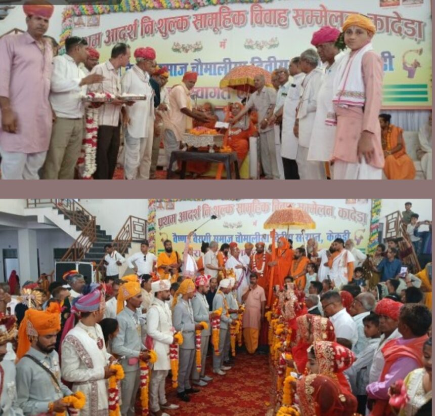 बिजयनगर (रामकिशन वैष्णव ) वैष्णव बैरागी समाज चौमालीसा द्वितीय संस्थान कादेड़ा के तत्वावधान में प्रथम आदर्श निःशुल्क सामूहिक विवाह सम्मेलन पंचमुखी पैलेस मे आयोजित हुआ, जिसमे 11 जोड़े वैदिक रीति-रिवाजों के साथ परिणय सूत्र में बंधे। सम्मेलन समिति अध्यक्ष गोपालदास वैष्णव (खवास) ने बताया कि उक्त आयोजन पूरी तरह निःशुल्क रखा गया, जिसमें वर-वधू पक्ष से किसी प्रकार का पंजीयन शुल्क नहीं लिया गया। कार्यक्रम में देशभर से पधारे संत-महात्माओं का सानिध्य प्राप्त हुआ, जिन्होंने नवदंपतियों को आशीर्वाद प्रदान किया। समारोह में सिगड़ापीठ अहमदाबाद के जगद्गुरु रामानंदाचार्य पद प्रतिष्ठित स्वामी श्री वैदेही बल्लभ देवाचार्य महाराज, श्री केवलारामाचार्य (कुबाजी) गादीपति, झीतड़ा (पाली) के द्वारापीठ के महंत वासुदेवाचार्य महाराज तथा काशी के पातालपुरी पीठाधीश्वर नरहर्यानंद महाराज सहित अनेक संत शिरोमणि शरीक हुए । शनिवार को प्रातः 8 बजे सभी वर वधुओ की निकासी शोभायात्रा गाजेबाजे के साथ धूमधाम से निकाली गई व 9:15 बजे तोरण की रस्म अदायगी की गई एवं वरमाला के कार्यक्रम के बाद पंडितो द्वारा अभिजीत मुहूर्त में पाणिग्रहण संस्कार सम्पन्न करवाया गया। इसके बाद आशीर्वाद समारोह आयोजित किया गया, जिसमे अतिथियों व संस्थान, आयोजको द्वारा वर वधु जोडो को आशीर्वाद प्रदान किया। संस्थान अध्यक्ष महावीर प्रसाद वैष्णव ने बताया कि नवदंपतियों को गृहस्थ जीवन की शुरुआत के लिए आवश्यक सामग्री भेंट की गई, जिसमें वस्त्र, फर्नीचर, घरेलू उपयोग की सामग्री एवं आभूषण शामिल हैं। विवाह सम्मेलन मे अखिल भारतीय वैष्णव ब्राह्मण महासभा के राष्ट्रीय अध्यक्ष श्याम सुन्दर वैष्णव हरिद्वार, उमाशंकर वैष्णव बिजौलिया, खुशीराम वैष्णव, पूर्व सरपंच आशाराम वैष्णव, उपाध्यक्ष राधेश्याम वैष्णव (चांदमा), घनश्याम वैष्णव, मनोहरदास खवास, बंशीदास देवपुरा, बजरंग वैष्णव (कंवरपुरा), मुकेश खवास, ओमप्रकाश गुलगांव सहित अजमेर, किशनगढ़, विजयनगर , ब्यावर, सरवाड़, केकड़ी सहित वैष्णव समाज की विभिन्न समितियों के अध्यक्ष, पदाधिकारी एवं गणमन्यजन, महिलाये, युवा लोग मौजूद थे।
